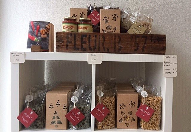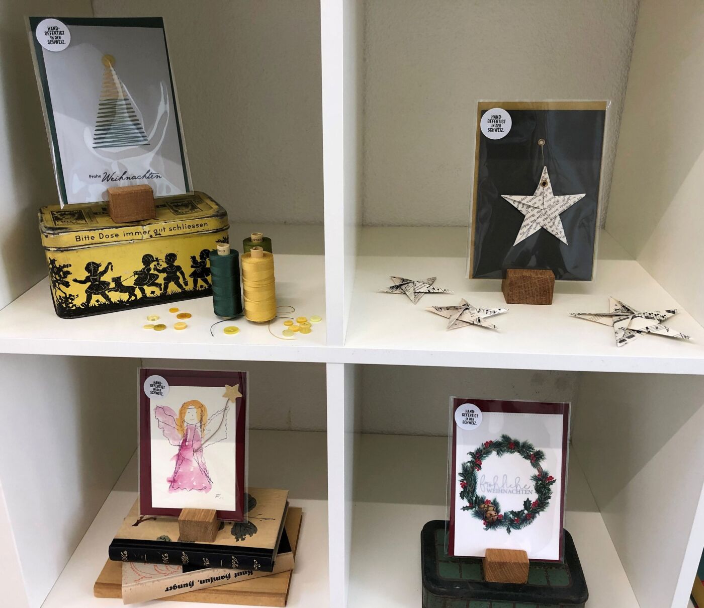 Klein aber fein ist das Weihnachtslädeli im Werkatelier (EG) an der Bleichemattstrasse 15 in Aarau. Ein vielfältiges Angebot – die untenstehenden Bilder zeigen es – alles von Hand gefertigt, made by Töpferhaus: Weihnachtskarten und kleine Geschenkartikel, Teigwaren «Pasta Mia» in verschiedenen Aromen und Formen, das Goldstück, ein mit Kakao- und Goldpulver bestäubtes Gianduja-Schöggeli und Bienenwachstücher «pateBee», die Alternative zu Alu- und Frischhaltefolie.