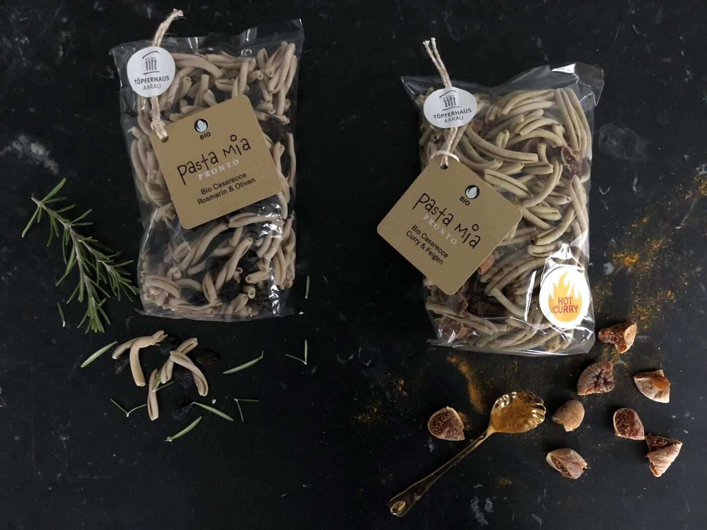 Zwei der insgesamt vier prämierten Pasta-Mia-Teigwaren sind aus der Linie PRONTO: die Casarecce Rosmarin & Oliven (links) und Casarecce Curry & Feigen (rechts).