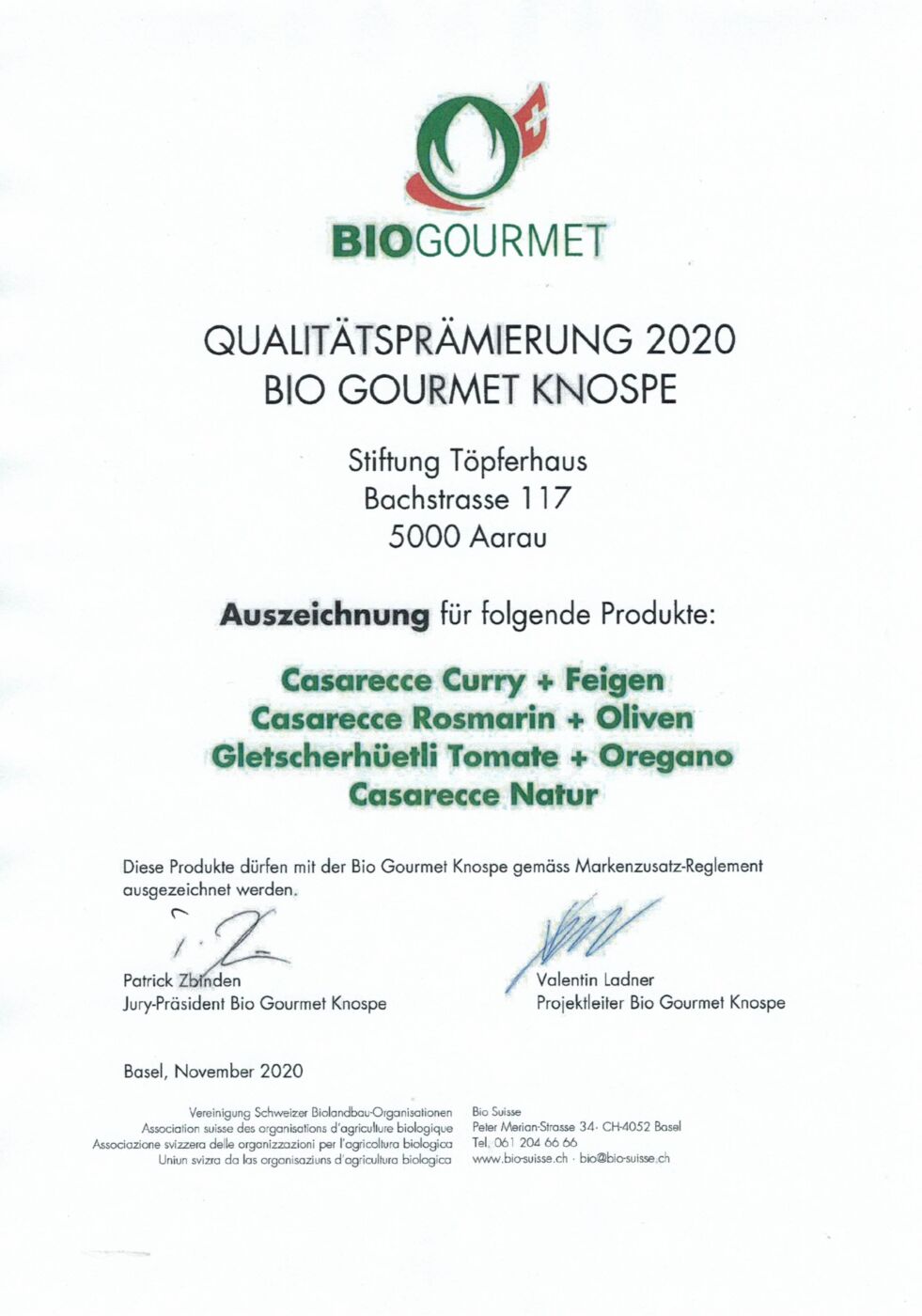 Das Zertifikat BIO GOURMET KNOSPE mit den prämierten Teigwaren-Sorten.