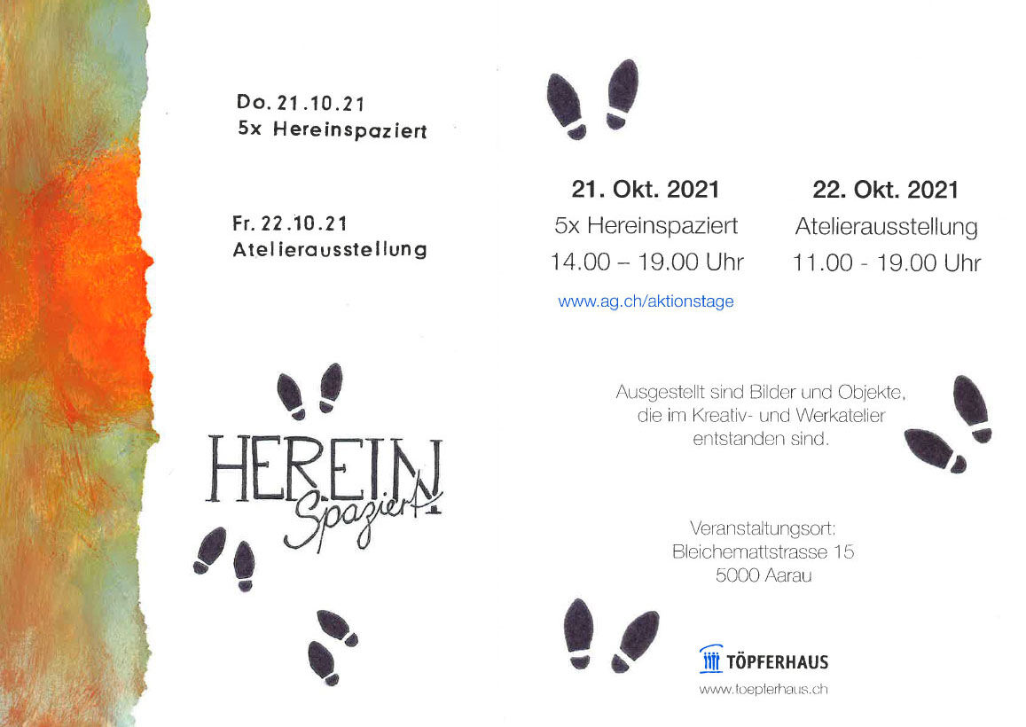 Gleichzeitig und auch am Folgetag, dem 22. Oktober 2021, findet die Ausstellung von Bildern und Objekten im Kreativ- und Werkatelier des Töpferhauses statt. Siehe auch Hinweis in der AZ.