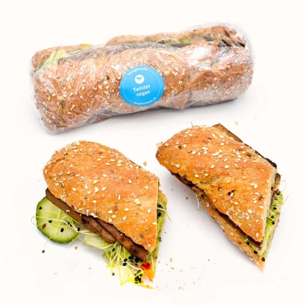 Veganes auf der Hand! Die Sandwich-Spezialität von Februar bis April geht so: Zwei Twisterhälften, dazwischen eingeklemmt Räuchertofu, Avocado, Bärlauch, Gurken, Tomaten, Zwiebelsprossen und Eisbergsalat.