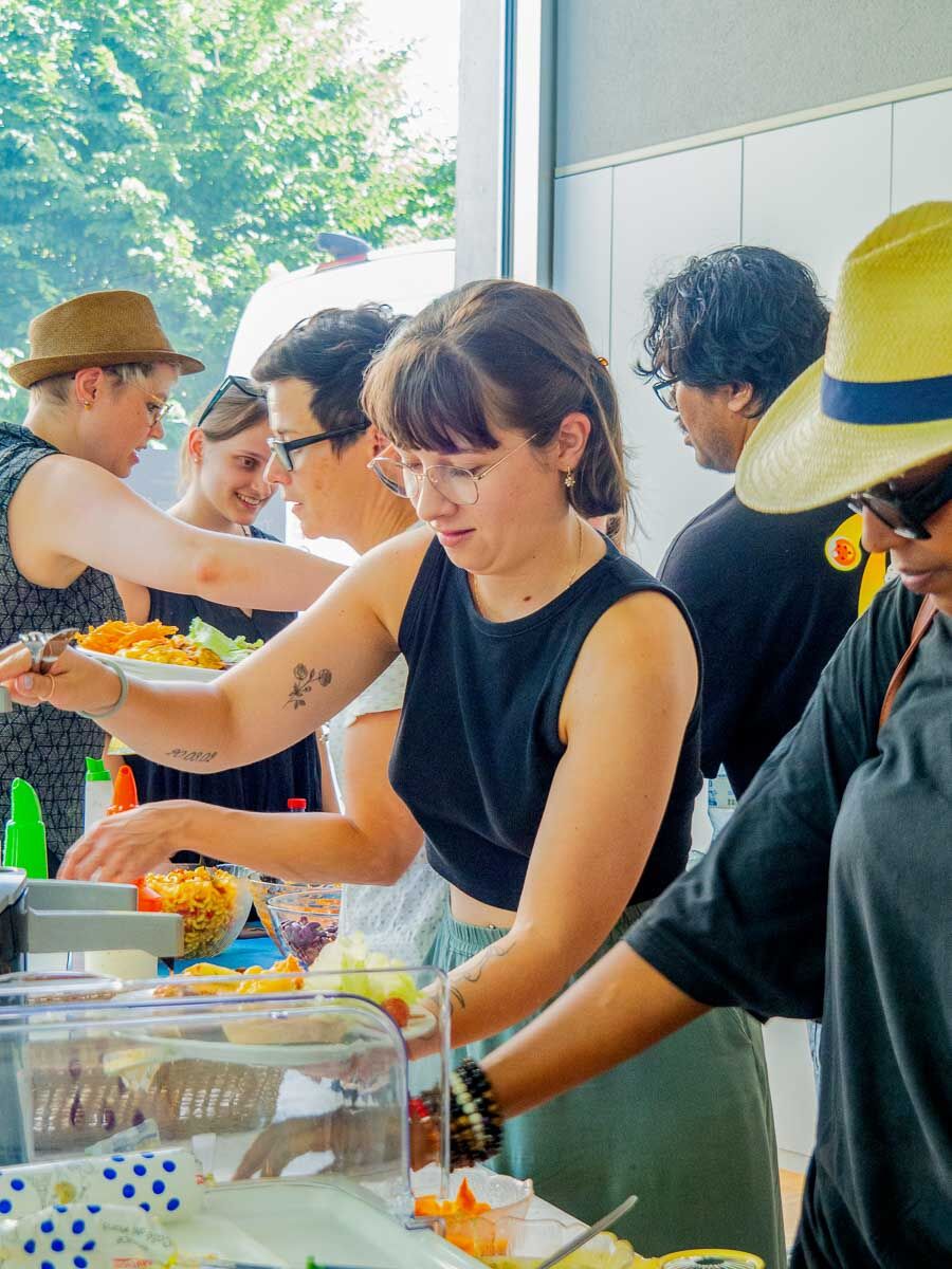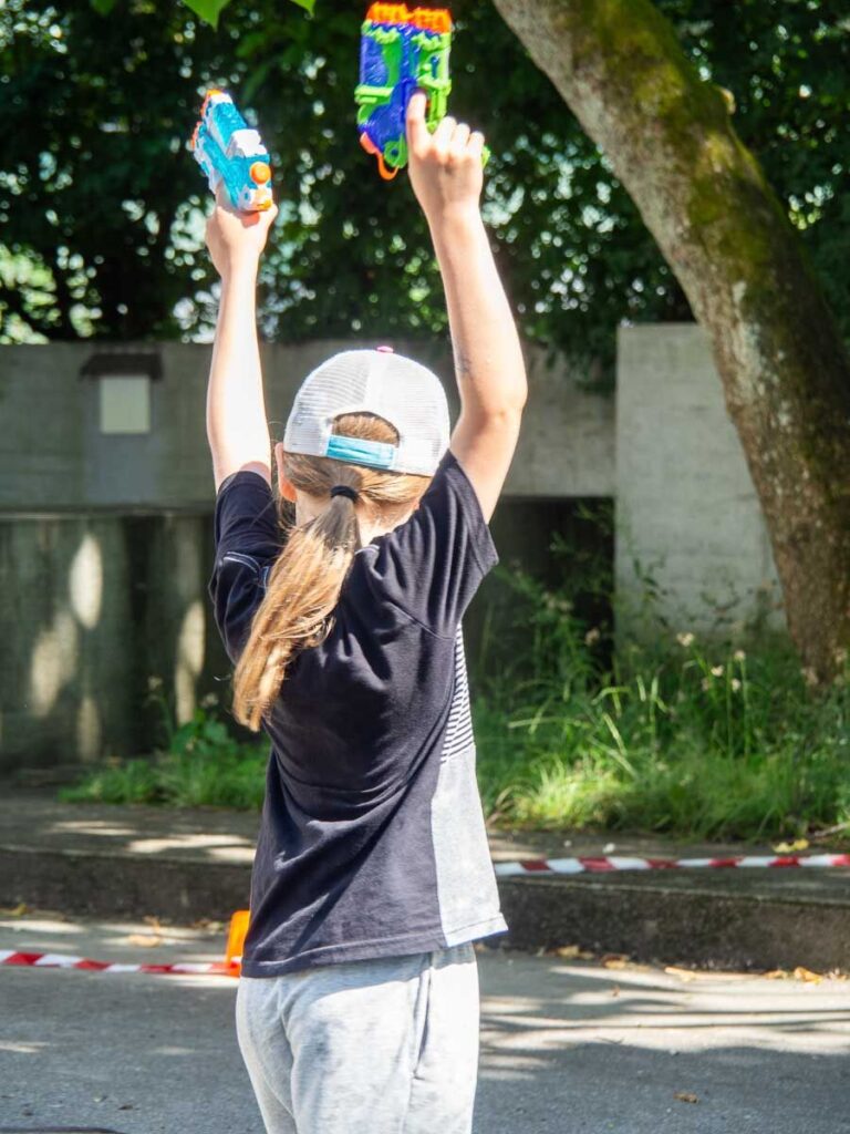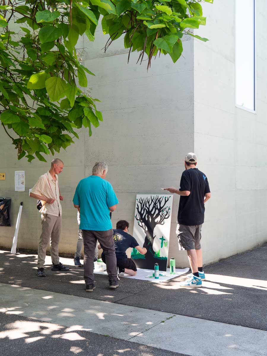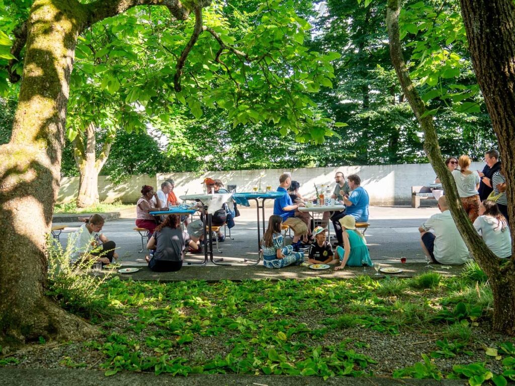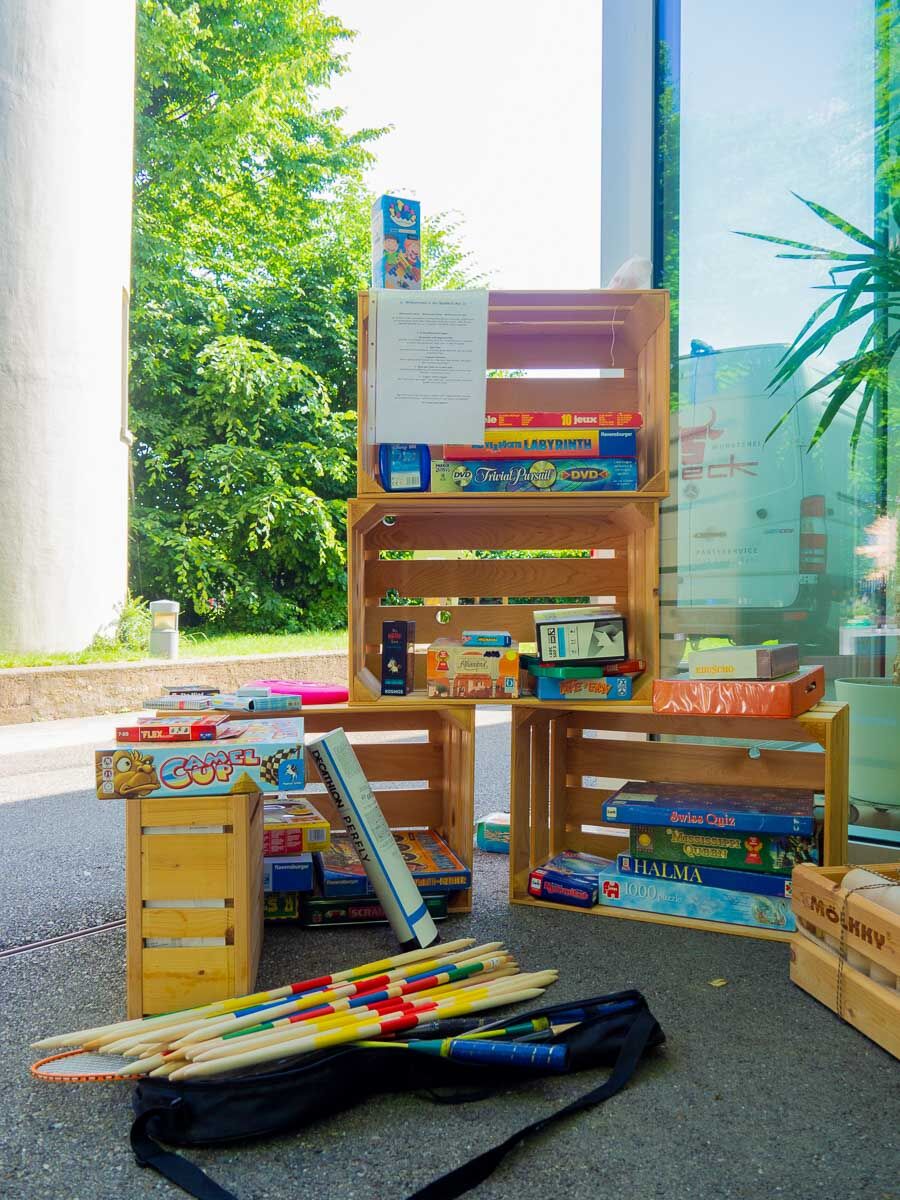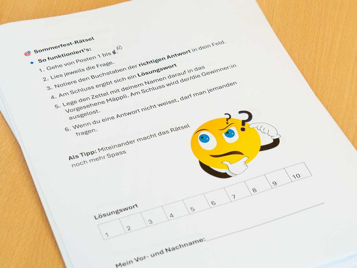 Zum Auftakt: feine Waffeln, Kaffee à la Italianità vom Barista. Erste Spielrunden mit Mikado, Halma, Swiss Quiz und vielem mehr. Fröhliche Seifenblasen steigen in den Himmel, Wasserspistolen sorgen für erfrischende Abkühlung. Ein Rätsel-Parcours fordert die Hirnzellen heraus. Auch das Gemeinschaftswerk nimmt Formen an.