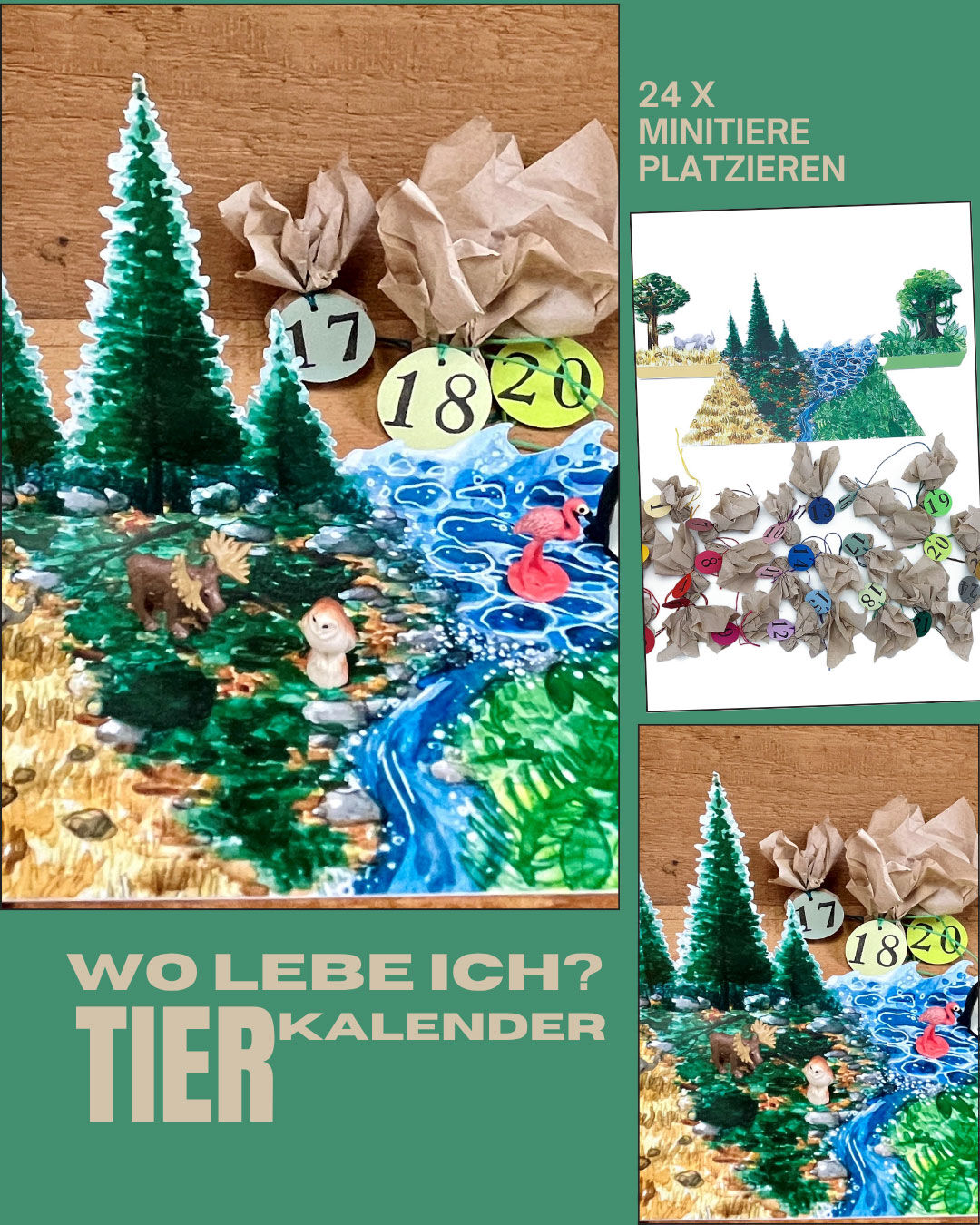 24 Miniaturtiere, verpackt in Recyclingpapier, warten darauf, ihren Lebensraum zu finden – Savanne, Urwald, Wasser oder Wald.